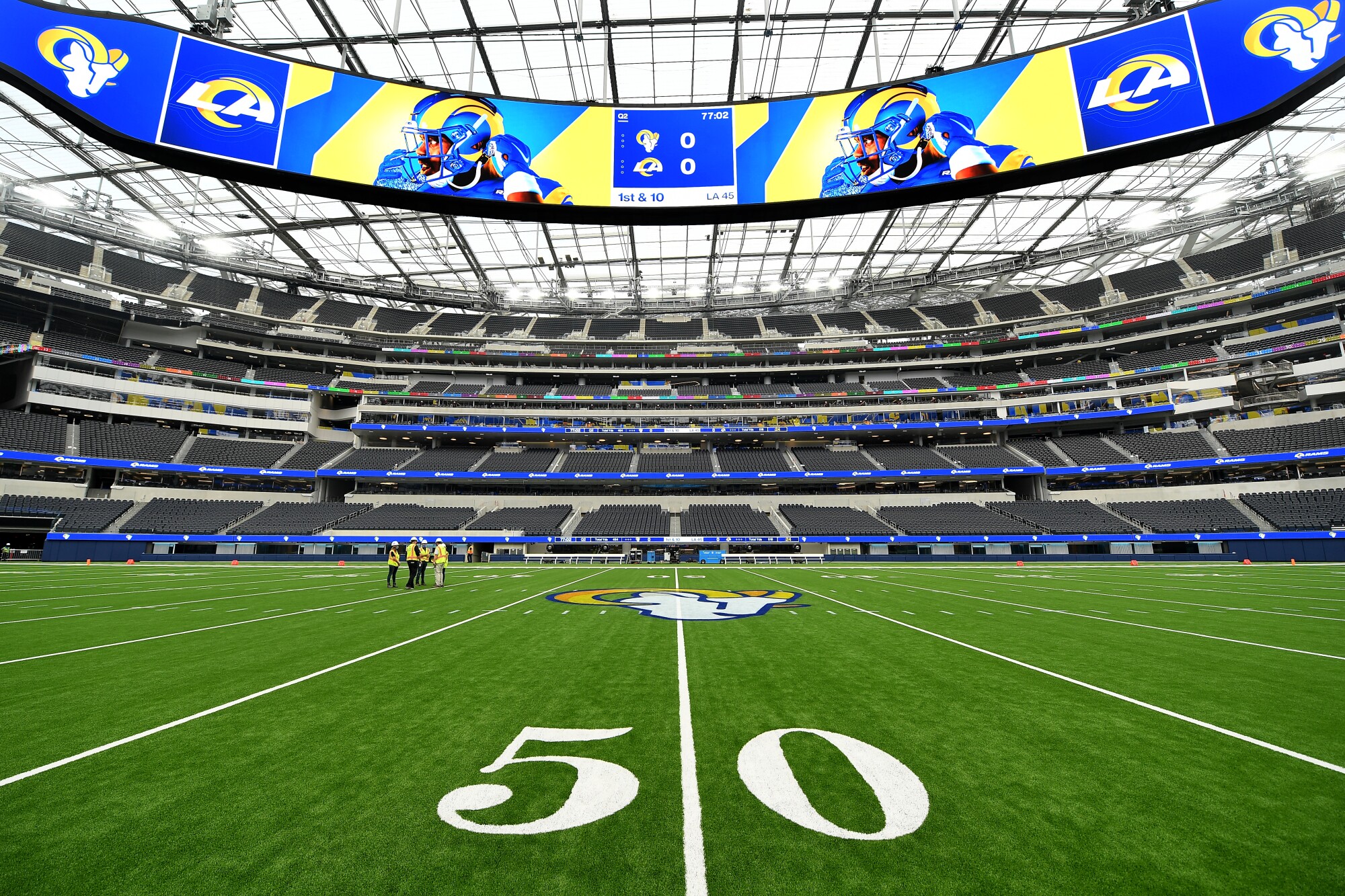 Both teams played their home games in the empty stadium last season the buildings first year being opened. It hosts both the Rams and Chargers in similar fashion to Metlife Stadium in the Meadowlands NJ. Will Brinson WillBrinson October 5 2021 Lightning delay in stadium with a roof pic.